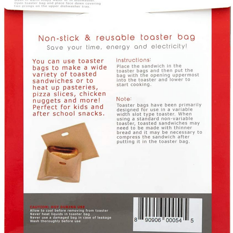 Toaster bags are a convenient way to quickly make toasted sandwiches and bagels, or even reheat burgers without using a whole toaster oven. Simply wipe or rinse the bags clean, and they are ready to be used again. One bag is reusable at least 50 times.